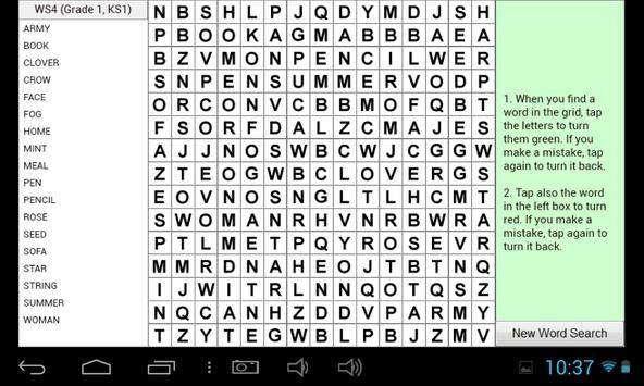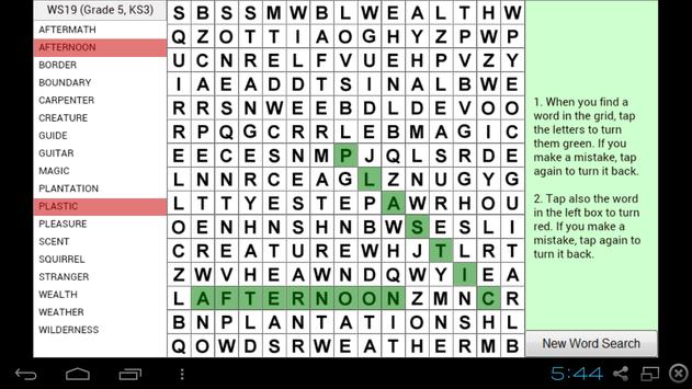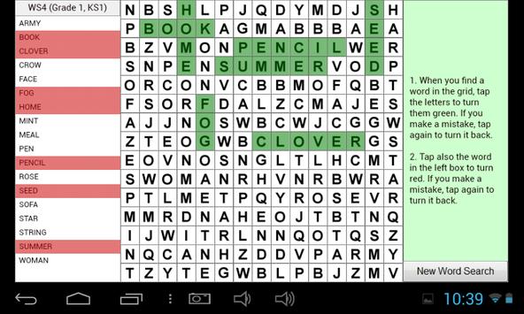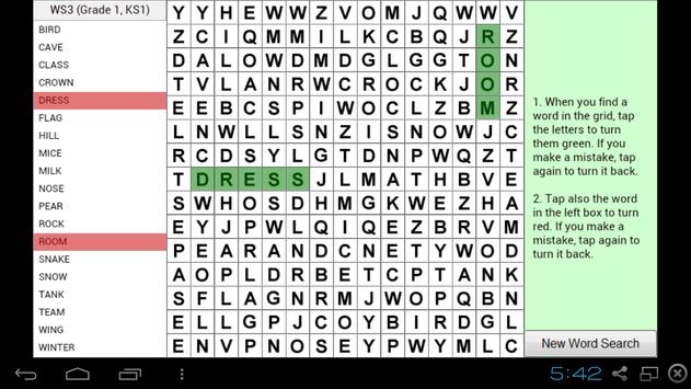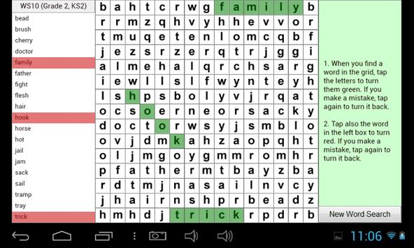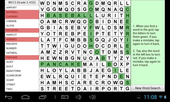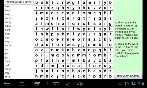 Word search game to help with learning English. Includes 20 word searches covering USA Grades 1 to 5, UK KS1 to KS3. Best played on a Tablet.