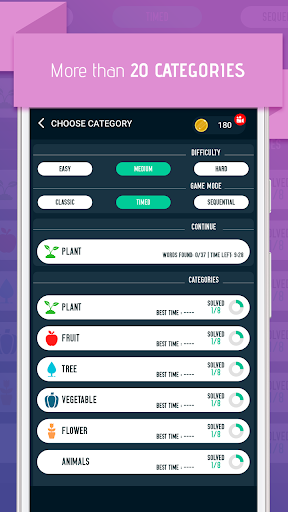 The goal of the Word King is to find all the hidden words in grids (diagonally, vertically, horizontally). Word King will increase your vocabulary, improve spelling and concentration. This Game have various Difficulties and Categories.