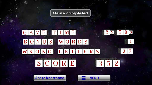 This is a high-concept game. However, the execution leaves much to be desired. Immediately upon starting a game, I found words that weren't on the list, hoping they'd be bonus words (like bee or garb) and lost points, because they weren't in either list! Unlisted words are a gamble! Furthermore, I find the point timer to be ridiculous and it should be removed or made toggleable. I also think it strange for you to get a hint after finding a bonus word — another feature that should be toggleable.
