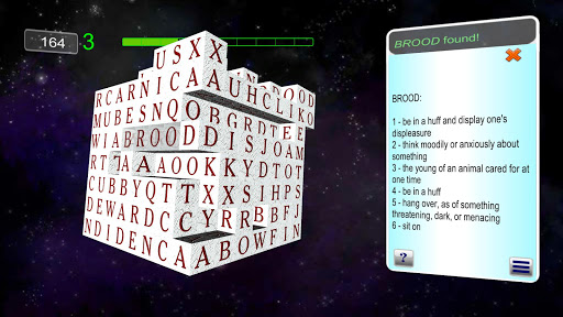 Word Search Cubes takes word search to the next dimension. All the words are hidden in a 3 dimensional cube, and each time you find a word the letters vanish and the cube gets smaller. When all the words have been found, the cube is gone! To find the words, you spin the cube around, then select the letters - if you are right, the word will disappear. You score points for finding the words quickly, and for finding bonus words. When you find a word, you can see its definition, a great way to build vocabulary skills. Word Cube is suitable for all ages, and with 4 games to choose from you can match your skills to the game.