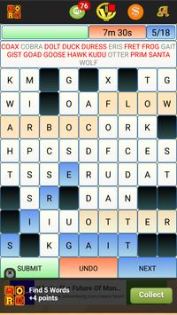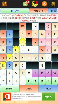 This is a highly customizable word search puzzle in which various words are arranged randomly and are "hidden" in a grid going in many directions, and your objective is find those words. You can select the size of the grid in which you want to play. You can also select the difficultly level - Easy (Words are from Top->Bottom, Left->Right, Diagonal top left -> bottom right), Medium (easy Bottom->top and Right->Left) and Hard (All 8 Directions). You can also choose whether you want the words to overlap or not. You can also select the minimum word size, thereby ensuring that you see bigger words. Select the word and then click Submit to check if you have the right word. The app keeps track of your score in terms how many words you were able to discover.