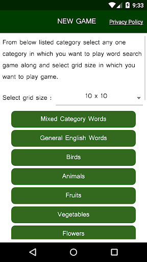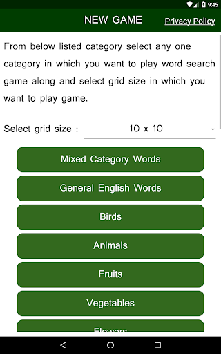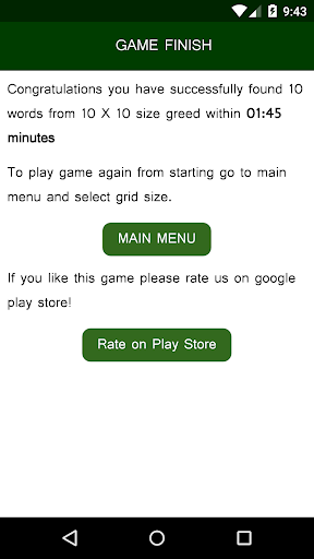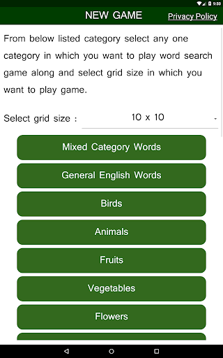 1) User has to select difficulty level to play "English Word Search Puzzle game".User can select difficulty level by selecting size of grid in which hidden English words are placed.Available size of greeds are 10X10 , 11X11,12X12 or 13X13 in which user has to find maximum 10,11,12 and 13 words respectively.