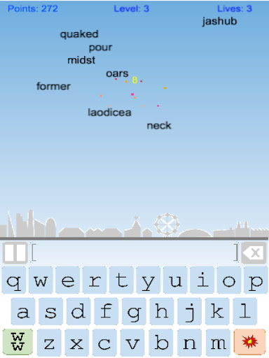 Falling words have to be destroyed before they reach the bottom of the screen by typing them out. Every level the words get longer and fall faster. However, in-game power-ups are available in exchange for earned points to make the fight easier.