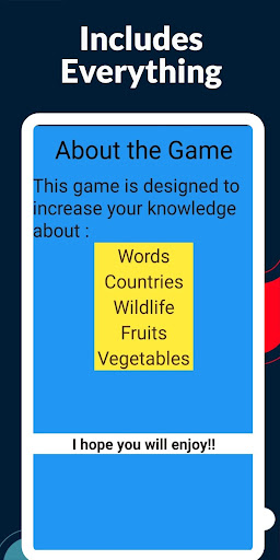 • English 3000 words with the names of countries ,wildlife ,fruits and vegetables are included in this wonderful game to tease your brain