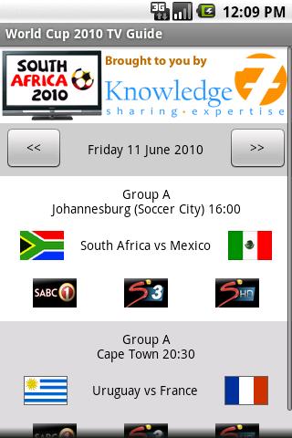This app is brought to you by Knowledge Seven Ltd http:www.knowledge7.comThe fifa World Cup 2010 is starting in a few days in South Africa. Use this application to know on which tv channels each match is being shown. Choose among the following countries: South Africa Mauritius Runion France United Kingdom United States ESTClick on a flag of a country for additional information