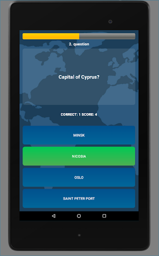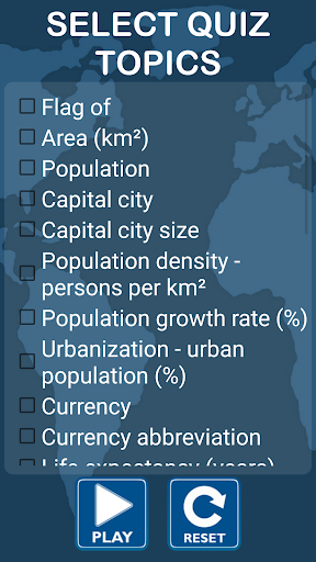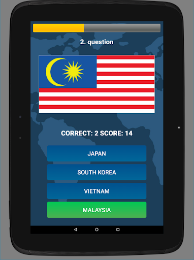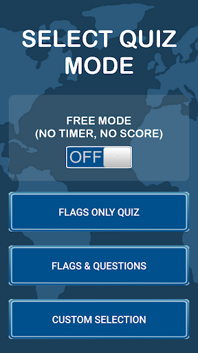 Several play modes are available. In FLAGS ONLY and FLAGS & QUESTIONS modes, you get 10 questions and 10 seconds per question. Score is equal to the number of seconds left before the timer runs out. In CUSTOM mode, you can choose what types of questions to include in the quiz and the score multiplier is applied - the more types of questions you select, the bigger the multiplier. In FREE mode, there is no timer, the number of questions is unlimited and explanation of the question terms is available. No points are awarded in Free mode.