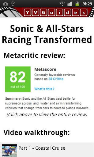 Welcome to 'Sonic & All-Stars Racing Transformed' unofficial video guide walkthrough & review for your android device! :)Here you can: - View the official Metacritic review of the game;- View the best game walkthrough in youtube to help you pass the difficult parts of the game.ATTENTION: - THIS IS NOT THE GAME!- YOU NEED TO HAVE THE YOUTUBE APP INSTALLED/UPDATED ON YOUR DEVICE!NOTES: - This is an unofficial video game guide walkthrough of the game;- All content in this app is from Metacritic and YouTube;- We do not own 'Sonic' nor we are associated with it;- The copyrighted material in this app is allowed by the COPYRIGHT LAW: FAIR USE;- All trademarks, logos, and images are property of their respective and rightful owners;- Any content will be removed if asked by the legal owners.
