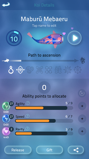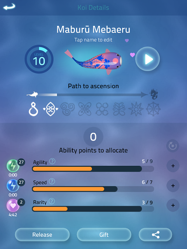 The 'My Pond' is like your own personal aquarium. You have a growing set of decorations that you can place, scale and rotate to create your own calm underwater zen garden. Decorations range from plants and rocks, to seasonal effects, sand ripples, flowers, and glowing stones. When you’ve finished decorating, all of your koi in your ‘My Koi’ list, glide into your pond to play.
