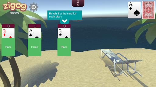 EASY: It is played by a total of 12 playing cards which are of 4 kinds (Hearts, Diamonds, Spades, and Clubs) each counting from 1 to 3. To begin with, 3 of the card s are turned up side to side at random. Then in the second turn, any of the next cards turned up is placed discretionally under any of the 3 columns of the cards. Following the third turn, finally the cards of the fourth turn are turned up and placed. The goal of the game is to achieve sum of 8 in each column of the cards.