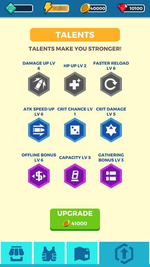 - 5 different kinds of guns ( to be expanded), each with unique features.