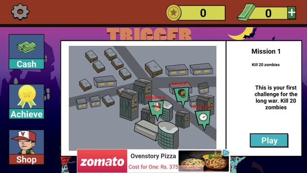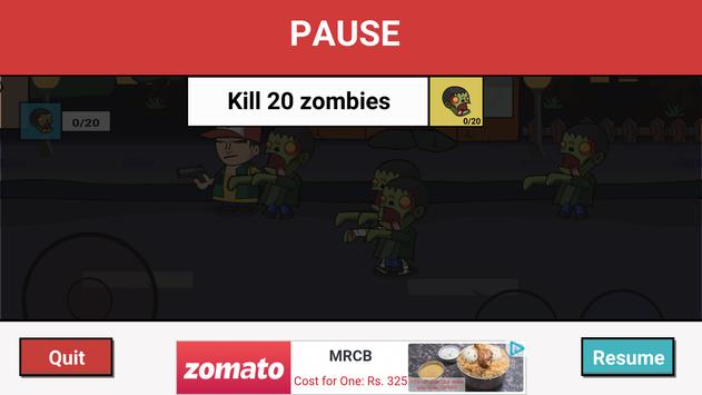 - Kill zombies with 10 weapons : gun , grenade and melee