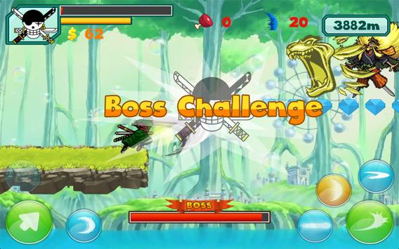 Roronoa Zoro his dream is to become the greatest swordsman in the world of one piece. He was the first member to join the Straw Hat Pirates, and, to date, is considered the largest threat and most dangerous member in the crew after Luffy. He like boat hunt. He departure for trained himself to become a greatest swordsman.