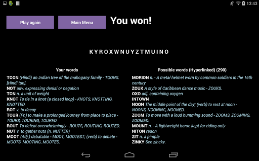 Computer makes a move every 6 seconds. The side that forms 10 words first wins the match. The words which are common between both the sides are not counted.
