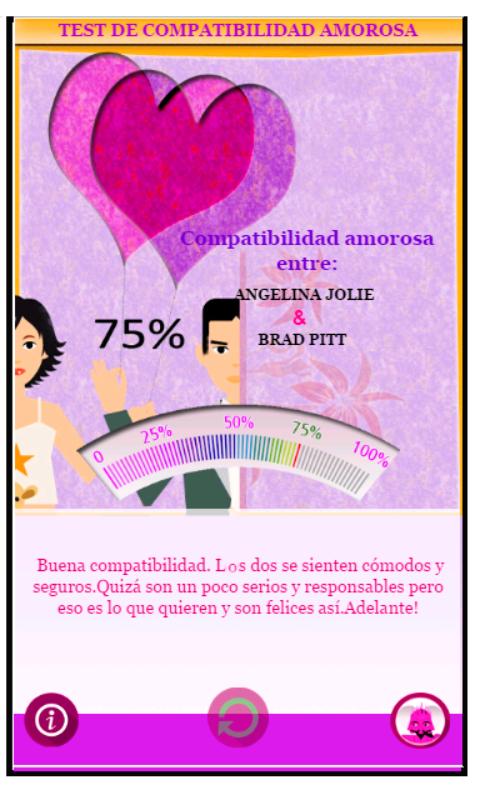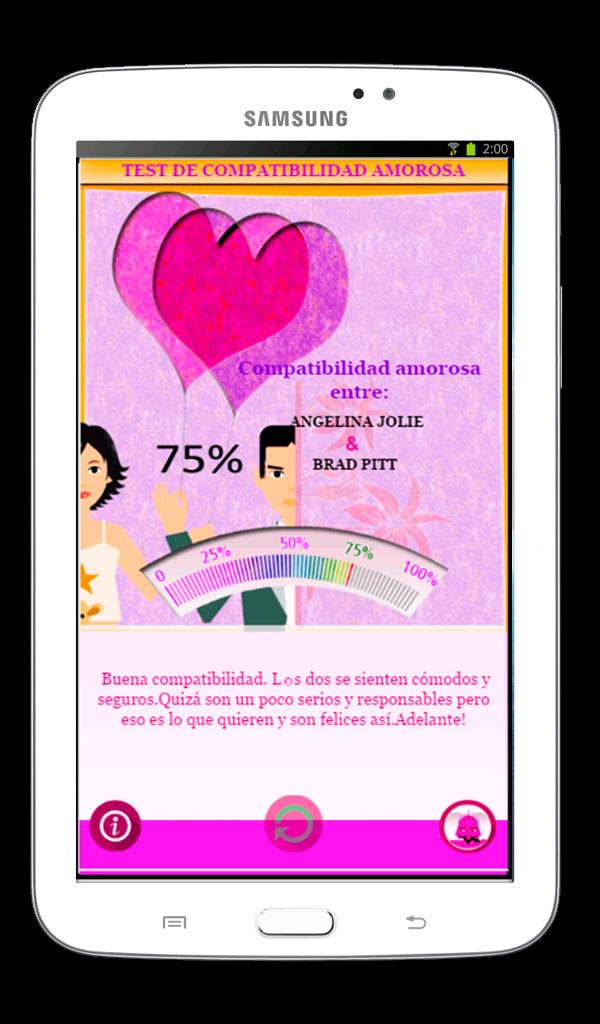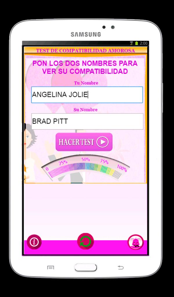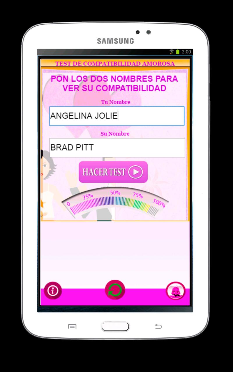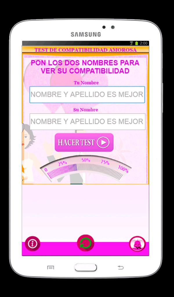 que te dará la compatibilidad amorosa entre dos personas. La aplicación fue creada por expertos teniendo en cuenta la compatibilidad numerológica. Cada persona por su nombre tiene un número que le corresponde. La aplicación calcula ese número y explica la compatibilidad en cuestiones amorosas. Si hay un porcentaje alto o bajo de compatibilidad. Además se dan consejos y se brindan ideas sobre el tipo de relación que se establecerá entre esas dos personas.Sólo tienes que poner sus nombres y la aplicación te dirá cuanta compatibilidad esas dos personas tienen.El sistema admite hasta 30 caracteres, lo que sobra para poner el nombre y apellido de las dos personas. Puedes hacer todas las consultas que quieras. La aplicación necesita conexión a internet. No exige permisos especiales en tu dispositivo y ocupa muy poco espacio.SÓLO DISPONIBLE EN CASTELLANO.