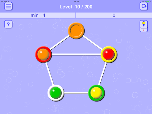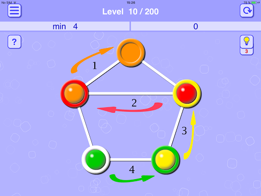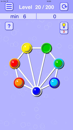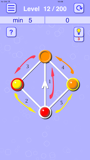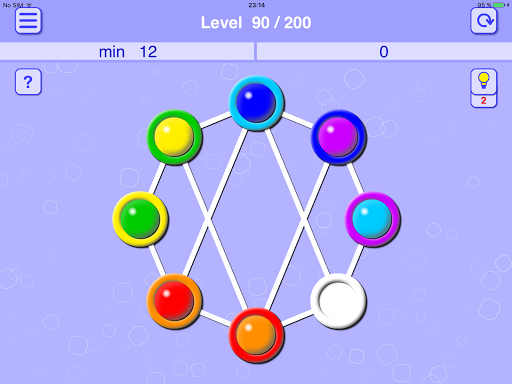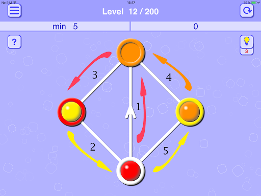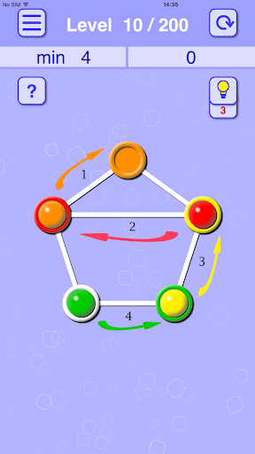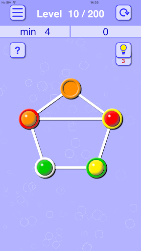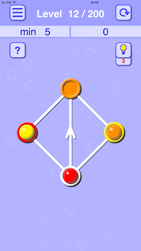 The game field represents a line, the balls, and the holes. The holes are connected by lines. The screen shows the number-the minimum number of steps required to move the balls along the lines. Exercise is considered to be solved if the minimum movement of each colored ball along the line will be in the hole of the corresponding color. After that, you will see a button to go to the next exercise. If during the game the number of steps exceeds the minimum, start the exercise again. If there are difficulties in performing exercises, you can use the tips. At the beginning of the game, you will have 3 tips.