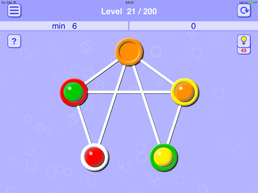 The goal of this puzzle game - the minimum number of steps to move the colored balls along the lines so that each colored ball is located in the hole of the same color.