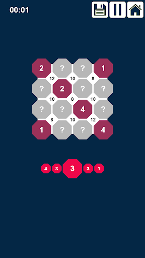 - fill in the empty circles (octagons) so that the number between the four adjacent circles is the result of their sum.