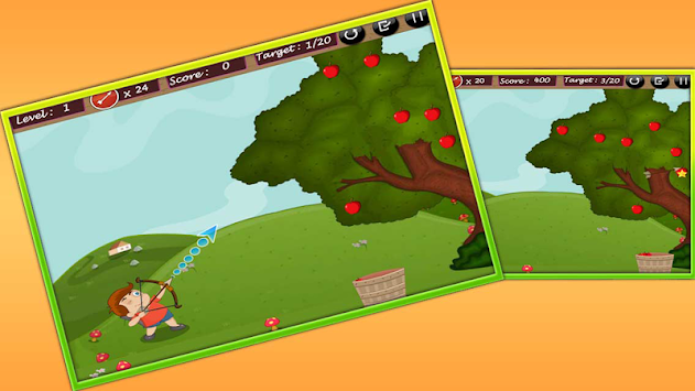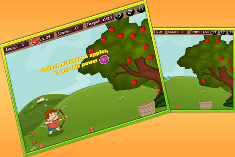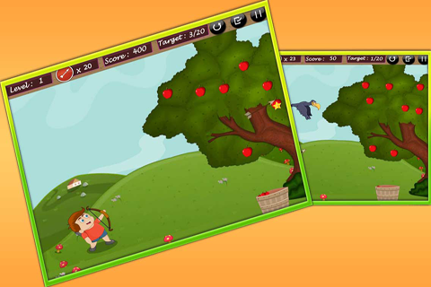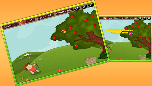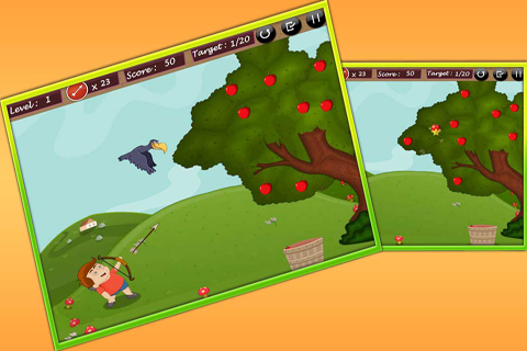 Aim to shoot an apple and a crow, so that crow doesn’t pluck your apples. Complete the given target before arrow finishes. Use bow and arrow icon to step ahead into the next tree. Have fun!