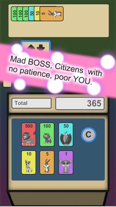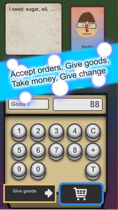 you are the cashier in small shop. You have an angry boss, inhabitants are impatient and you have to change everything. Sell goods, take money and give change. Be influenced by situations into which the cashier of shop gets. But remember - your boss is very angry for the whole world.