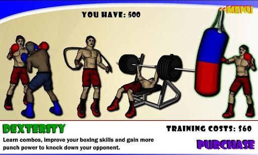 You start as a rookie and climb the ladder of success all the way to the top. And as your boxing career progresses you'll also increase your boxer’s attributes with the training simulation for Sparring or adding Stamina, Strength and dexterity to increase and improve your boxer’s skills. Giving you the experience of what it’s like to become a professional boxer.
