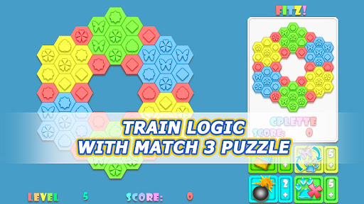 Fitz! game has proven to be a true casual game hit! It’s an offline Match-3 game which sometimes requires both skill and luck to pass. The goal is to repaint the board to color white, thus you may have to make a few matches over some tiles to achieve. The puzzle features a variable grid, which means you may face either square or hexagonal tiles.