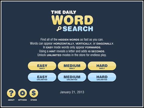 Daily Word Search features three FREE daily games across three difficulty levels and uses a customized 5000-word database. Games are timed and can be paused. Unlimited play modes are available for purchase. There's also a hint feature in case you get really stuck. All of the artwork is in glorious HD - so things look great on high resolution displays.