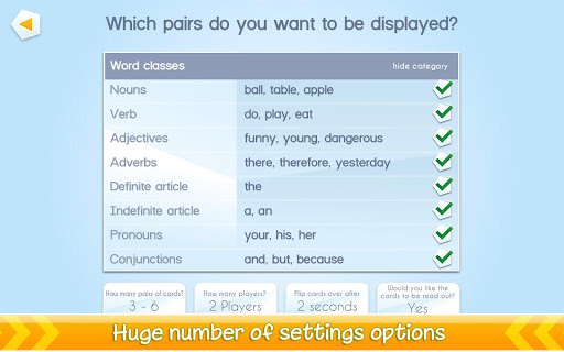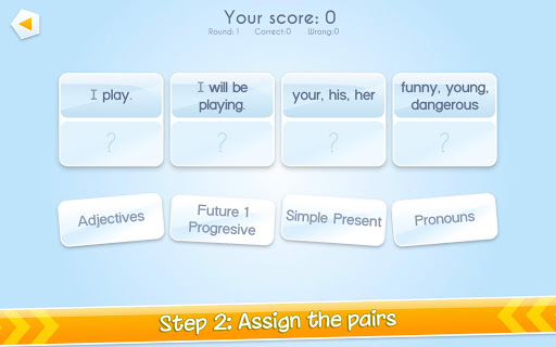 This entertaining and educational matching game app helps you practice your English grammar and spelling in a fun way. Whether you need to brush up on parts of speech, conjugation or declination, tenses and types of sentences - no matter what you need, the various grammatical areas can be combined with each other and practiced. With one click, the appropriate themes are chosen, easy as pie, and you can start right away. Matching pairs must be found, either by purely assigning terms to the proper categories (funny = Adjectives | I would like to play = Futur 1) or as a concentration-enhancing matching game.