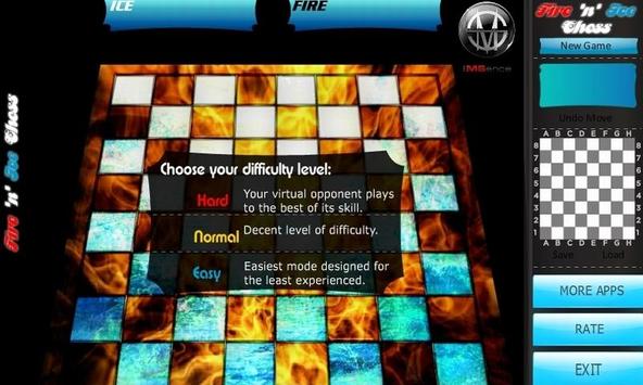 Fire and Ice Chess is one of the most unique chess games in the market due to its astounding graphics, simplicty, smart AI, and the sheer idea of the "fire vs ice" battle. The player is offered three different levels of difficulty to suit the needs of everyone. Of course, it has standard features that you would expect from a game like this, namely undo move, an option to save your game, etc.