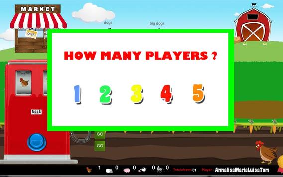 This game is like a board game, you run the gasoline machine button and discover what animal have won, when this happen you will heard a noise of the animal. In your turn, you can go to the market to buy the rest of animal but be aware of wild beast !!you can protect youself with dog and hunter.