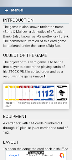 The object of this card game is to be the first player to discard all the playing cards from his deck in the order 1 to 12 and thus win the game.