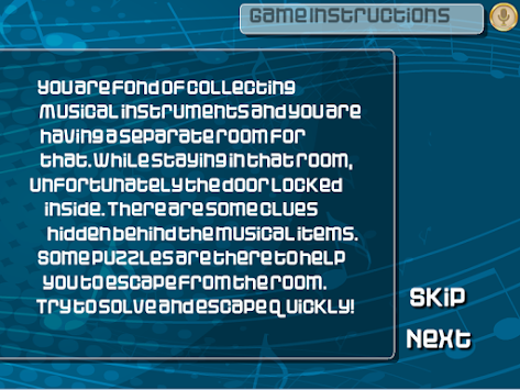 You are fond of collecting Musical instruments and you are having a separate room for that. While staying in that room, unfortunately the door locked inside. There are some clues hidden behind the musical items. Some puzzles are there to help you to escape from the room. Try to solve and escape quickly!