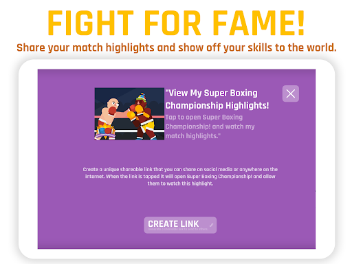 Share your skills with the world! After a match, your best KO highlights are replayed and you can generate a shareable link to send to your friends, social media, or anywhere else on the internet! Anyone who opens the link will then be able to watch the match highlights in Super Boxing Championship!