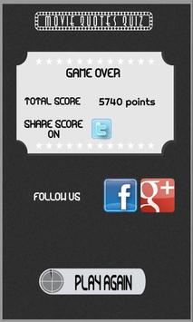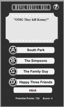 Well there are the basic trivia games rule, in which you get a question, four answers, a hint and a fact of the movie, what you will have to do is read the quote and try to guess in which movie it was used. Each correct answer gives you 300 points, you get about 30 seconds to give a answer, if you do it in time you can get from 0 to 1000 points more depending on how fast you get to check the right answer, also if you get in trouble and don't know the answer, you can touch the hint button which may give you a word, a phrase or even a fact that can help you get the correct answer, also this help can cost you again 300 points.