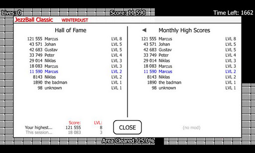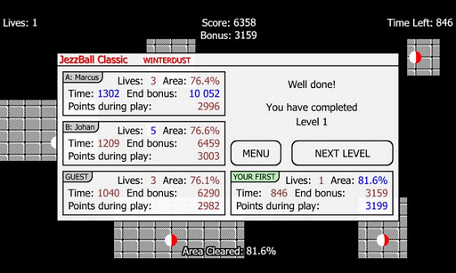 JezzBall Classic was created to be just like how the original JezzBall was 25 years ago! The graphics, the sound, the scoring, the physics, the tempo... they are all the same as they were in the original. Of course there are improvements as well; for example there's a much higher frame rate and fixed glitches. Plus a lot of bonus stuff, such as new game modes!