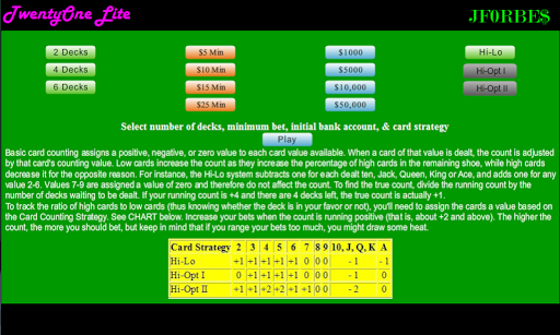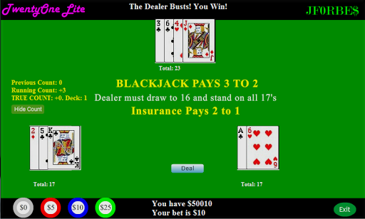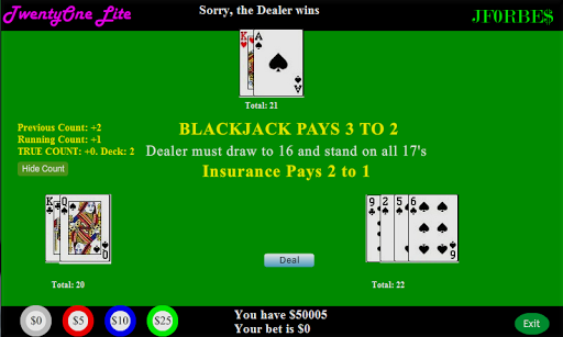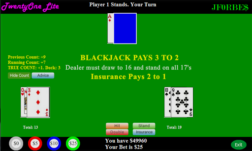 TwentyOne Lite helps you learn card counting techniques for Blackjack using 2-6 decks and multiple simulated players. Basic card counting assigns a positive, negative, or zero value to each card value available. When a card of that value is dealt, the count is adjusted by that card's counting value. Low cards increase the count as they increase the percentage of high cards in the remaining shoe, while high cards decrease it for the opposite reason. TwentyOne Lite features the Hi-Lo system that subtracts one for each dealt ten, Jack, Queen, King or Ace, and adds one for any value 2-6. Values 7-9 are assigned a value of zero and therefore do not affect the count. To find the true count, divide the running count by the number of decks waiting to be dealt. If your running count is +4 and there are 4 decks left, the true count is actually +1. TwentyOne Lite allows you to show or hide the card count at the touch of a button to test how well you are learning the system.