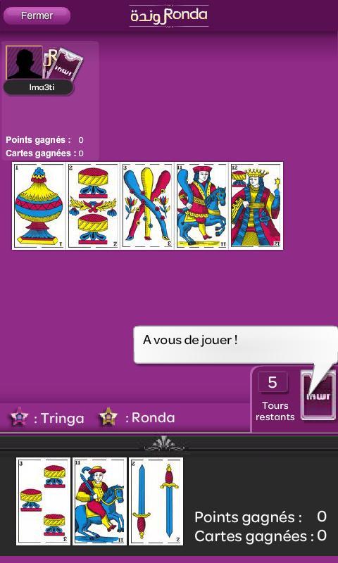 Ronda est un jeu de cartes marocain qui se joue avec des cartes espagnoles. C’est un jeu de 40 cartes avec 4 Couleurs : Dheb (Or), khel (Bâton), Copas (Coupe) et Sbada (Epée).