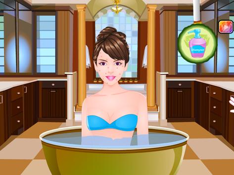 1) First you will have to help her to make bath. The young girl is already in the tub and you have to wash her hair, you must choose carefully one of the bottles of shampoo and then rinse well with warm water. Massage the scalp with special gloves that you may select with a single click.