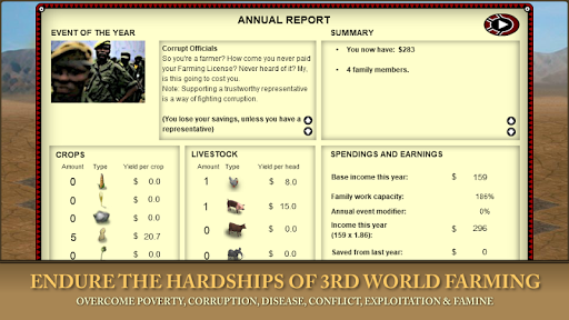 Take on the role of a farmer in a poor country. Will you prosper despite corruption and lack of basic neccessities? Or will endless wars, diseases, droughts, and unreliable markets perpetuate your economic disadvantage and spell your ultimate doom?
