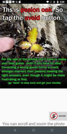 Learn to recognize poison oak from 120 photos in this simple active learning flashcard training game. Remembers what you got wrong so you can train on your mistakes. This paid version of our free app has no ads, no in app purchases.