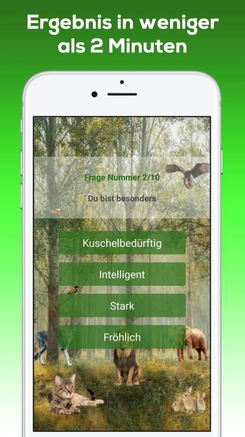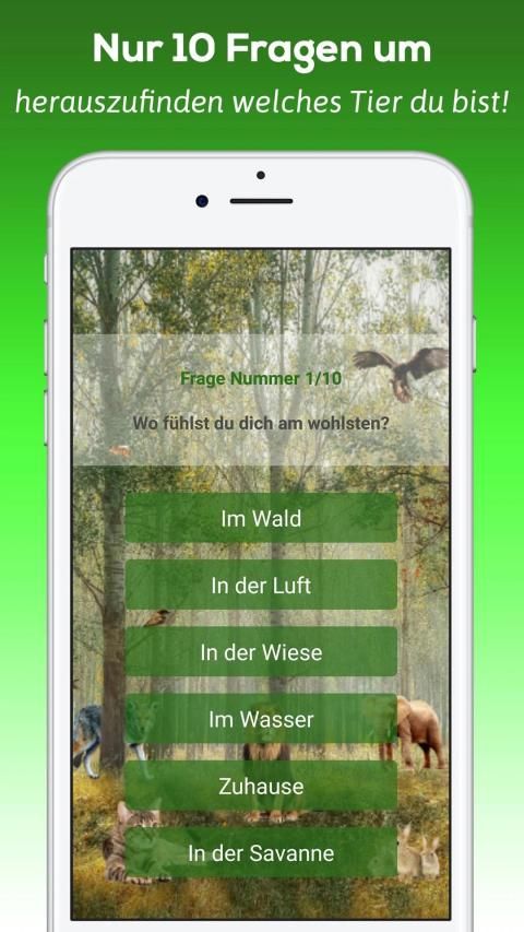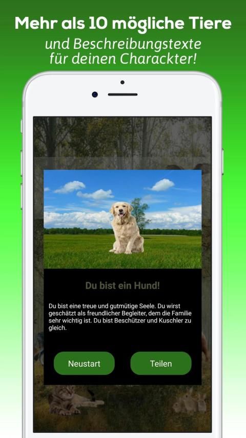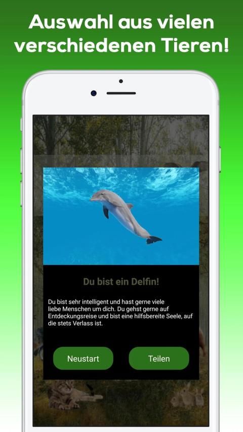 Welches Tier bist du!? Wolltest du nicht immer schon wissen, welches Tier du wärst? Diese Test-App verrät es dir! Mit Hilfe von zehn einfachen Fragen erfährst du welches Tier am besten zu dir passt. Versuche dabei das Quiz so ehrlich wie möglich zu beantworten, damit du erfährst, ob du so abenteuerlustig wie ein Delfin, oder doch gesellig wie ein Hund, bist.