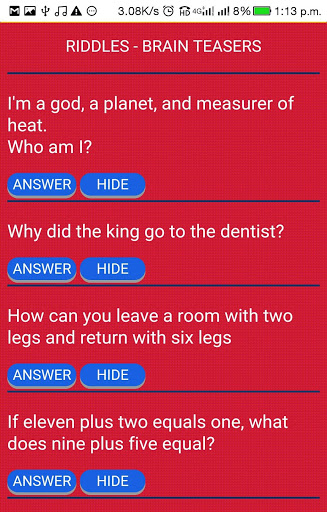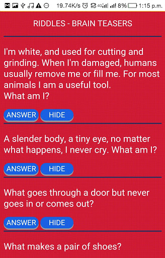 Do you like to enjoy reading English riddles and logic brain teasers . If yes this amazing app is for you. User friendly Design. Answer and Hide option.