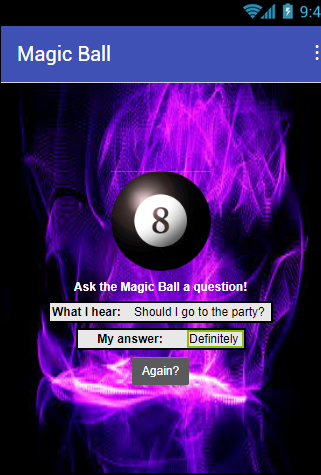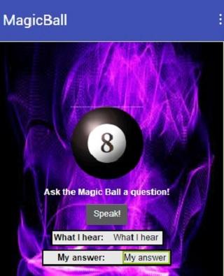 This magic ball answers all your questions. Simply press the button to speak to the ball and get instant answers to all your questions. This app is developed by clarence.guru as part of the demonstration material to teach introduction to Information Technology for Stage 5 at Parkes Christian School. It shows the application of randomised data as well as the accelerometer and speech recognition capability using procedures, local and global variables. Through this app it is hoped that students will be able to further improve on it and see other potentials to develop app using similar concepts and ideas.