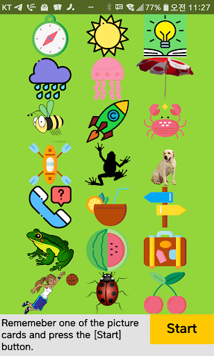 1. First, 21 picture cards are shown on the screen, and one of them is remembered by the player.