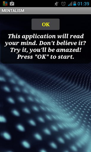 This application will read in your mind. Try it and see. The Mentalist reads your mind, guess the number you chose. Find out how you can do this is a real mystery. App magic, sleight of hand. You can use it to pretend to be a magician and have fun with your friends with this game of magic.In this app are magical numbers, think of a number and the magician the guesses. Telepathy, illusionism, black magic, clairvoyance, psychic powers or what? Pretend you too an illusionist, a Seer and impresses everyone.