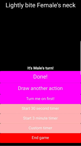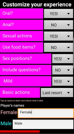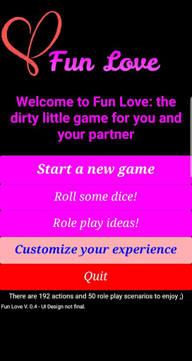 Love life getting a little dull or boring? Spice it up with this fun couples sex game! Choose your experience, what you're comfortable with and take turns doing amazing things to or with each other! No ads through the entire game so you can focus on what's important: each other. There are over 190 actions and I plan on adding tons more. All actions are unique and fun! The UI is not final and still needs some work, but the game is fun!