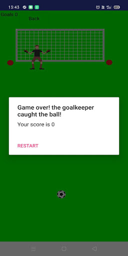 This game is very simple to play. the goalkeeper which is just an imagesprite, will move side to side form left to right. You have to just fling the ball and target the goal. If you hit the ball to the goalkeeper then you lose. maximum level of goals is infinite.It is very easy to play and ca be played whenever and wherever you want without WIFI or internet connection.