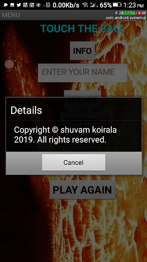 the players scores a point and radius of the ball is increased by certain amount.When the ball vanishes from the screen then the game is over. Player can enjoy the ball rolling sound in the background and it stops when the ball is to vanish from the screen. When the