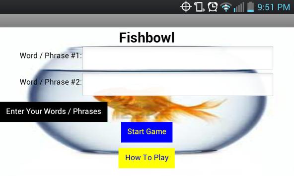 Each player puts two entries into the fish bowl and then passes to the next player. Once all players have added their entries, the group shall be divided into two teams. Upon starting the game, each team tries to get their teammates to guess the entry displayed which is chosen at random. Please see Help Menu for additional information on how to play. Enjoy!