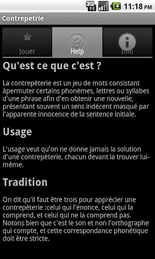 Testez vos connaissances des contrepèteries grâce à cette application entièrement gratuite. Plus de 1000 contrepèteries dans votre téléphone portable.Serez vous assez fort pour résoudre toutes ces contrepèteries ? Défiez vos amis avec ce jeux, et que le meilleur gagne.