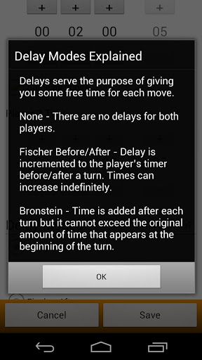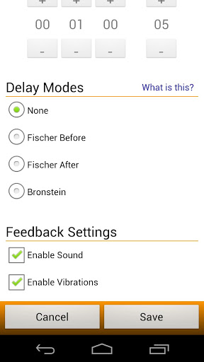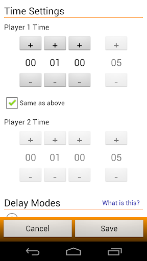 - Delay modes: Fischer Before/After, Bronstein chess timer modes